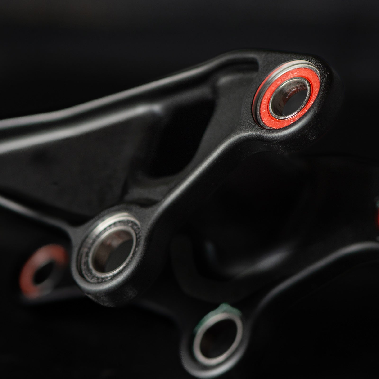 All pivots spin on Enduro MAX bearings that are well-sealed, long-lasting, and commonly available through most local bike shops or as kits on our website. The pivot hardware is machined from high-strength 7075 aluminum.