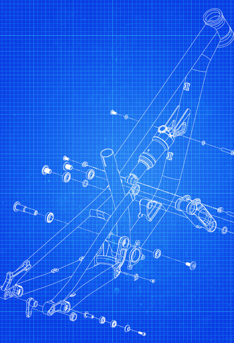 We chose a 4-bar suspension layout for the V2, with a main pivot located just above the bottom bracket, a seattube-mounted rocker link, and a vertically oriented, trunnion-mounted shock. We found this layout to strike a good balance of tuneability, ride quality, and elegant simplicity. A 4-bar layout offered enough tuning parameters for us to design the suspension characteristics the way we wanted them, simultaneously achieving our targets for leverage ratio, progression, anti-squat, and anti-rise.